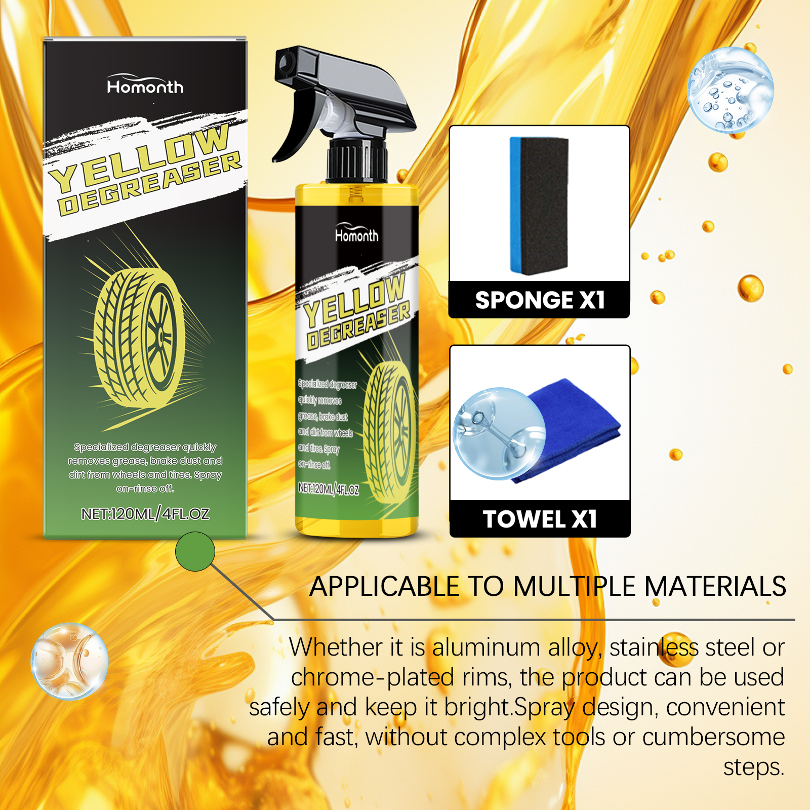 Homonth Car Wheel Cleaner tackles tough dirt, grease, road residue, and rust on car wheels, tires, and rims with a fast-acting formula that dissolves stains in minutes. Ideal for vehicle maintenance, it’s designed to keep surfaces looking refurbished—no more stubborn grime or dull finishes.